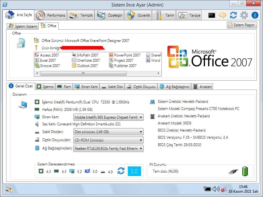 Ama üçüncü parti yerli-milli yazılımla (Sistem İnce Ayar v5.0) yüklü ofis sürümü görülmekte...