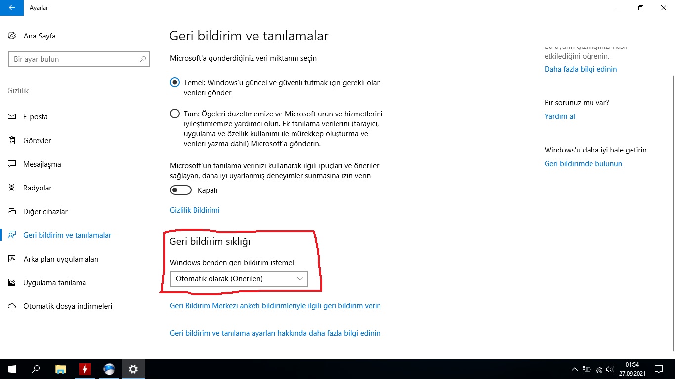 -windows benden geri bildirim istemeli altındaki ayar bende hep