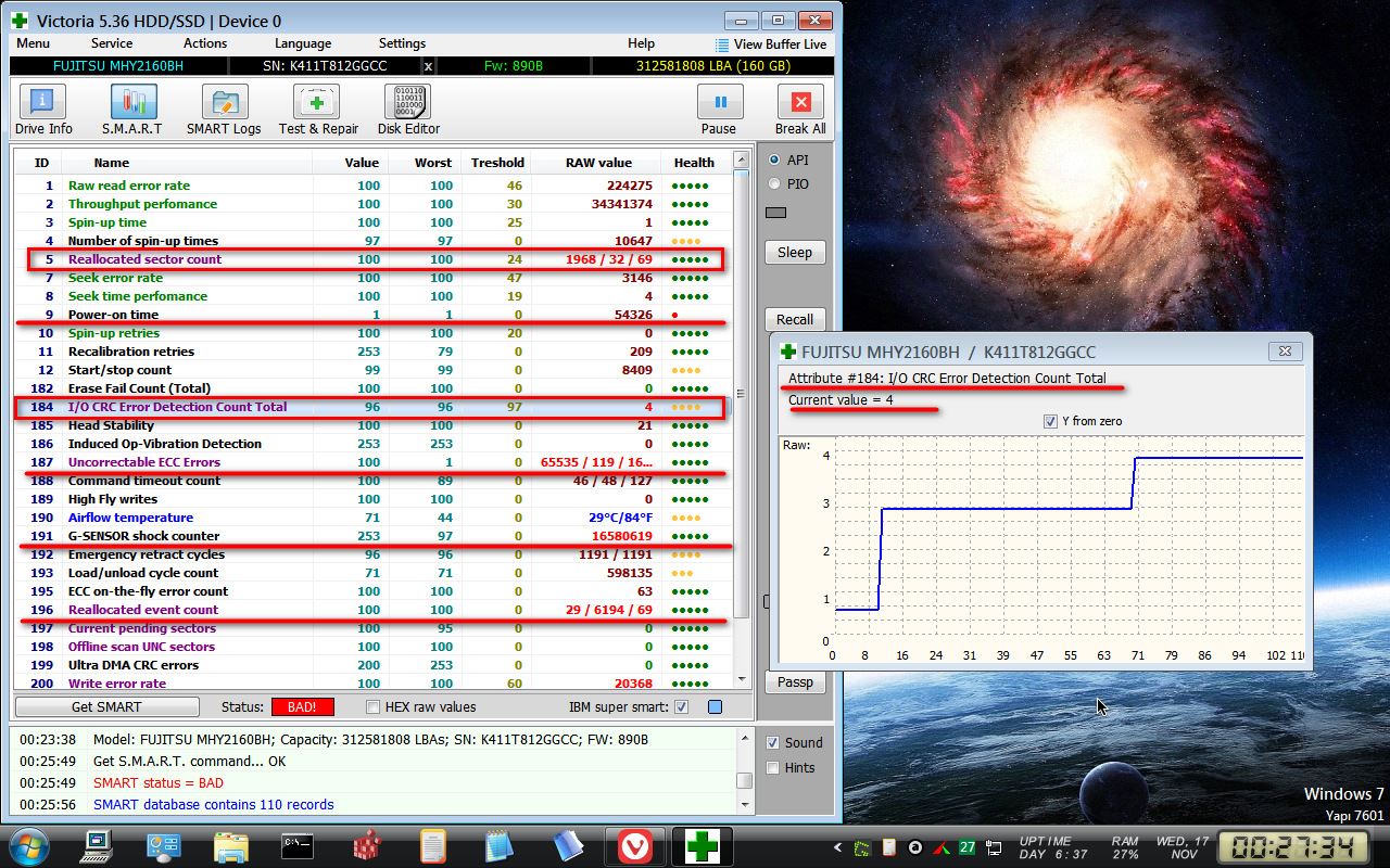 Aşağıda en önemli oan CRC ile bağlayan Hash Çözümleme hatası ki bu "GERÇEK FİZİKSEL HASARLI KÜME/KÜMELERİ" göstermektedir.Ve bu hatanın "GERİ DÖNÜŞÜ YOK" yani 15 senelik disk ölüm yoluna girmiştir.Her an beni yarı yolda bırakabilir.